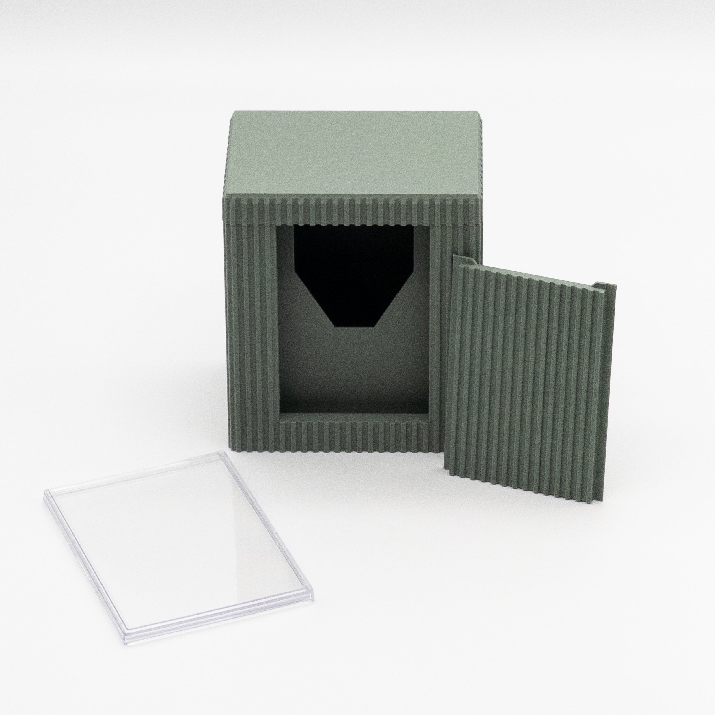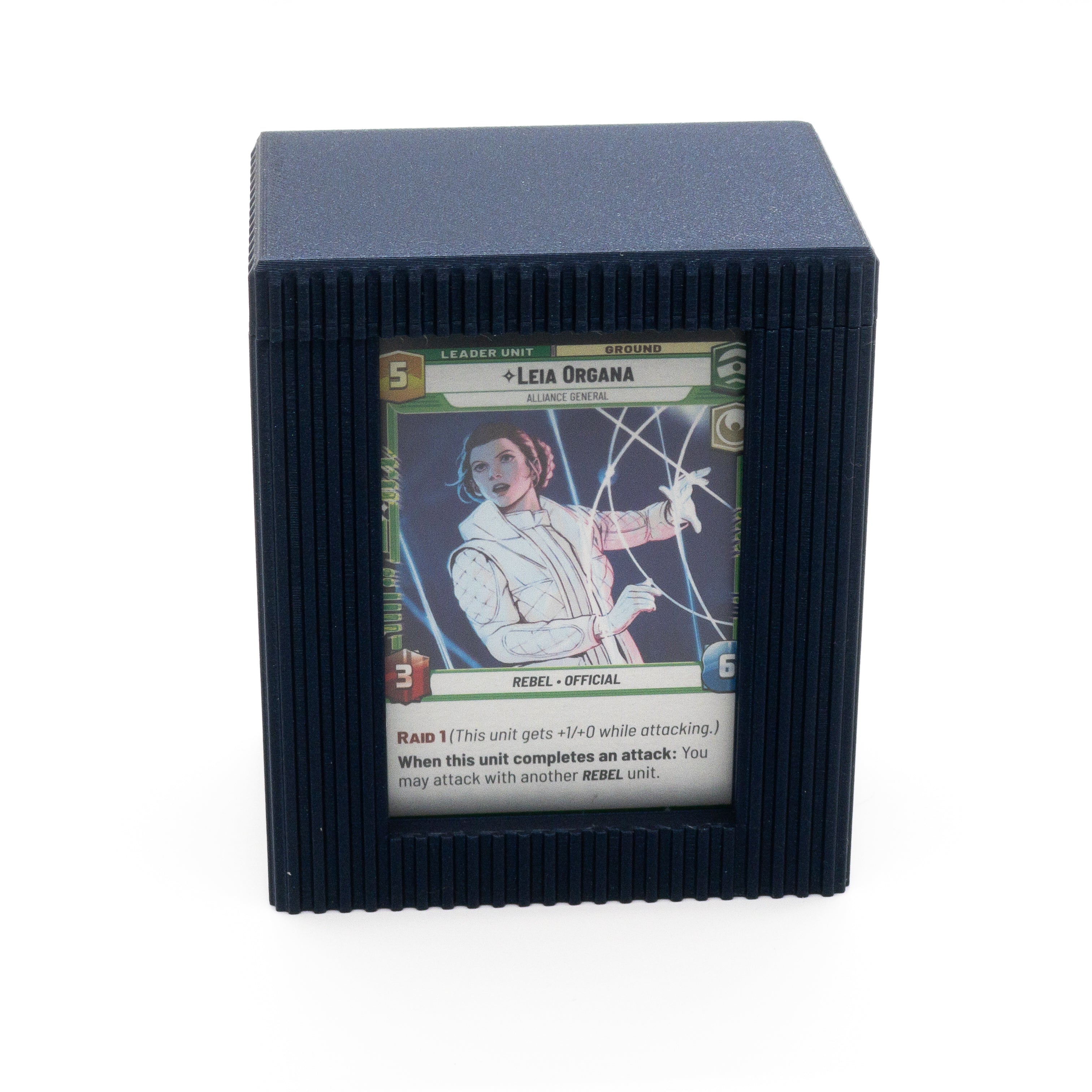 Our BTB Deckbox is truly something to bring your trading card game collection to the next level. This is our full art box with a mini snap to display your leader or a special card, but it also have it protected. This box holds 70 single-sleeved cards; it will also hold 60 double-sleeved cards very tight.  See the dimensions below to verify your fit.