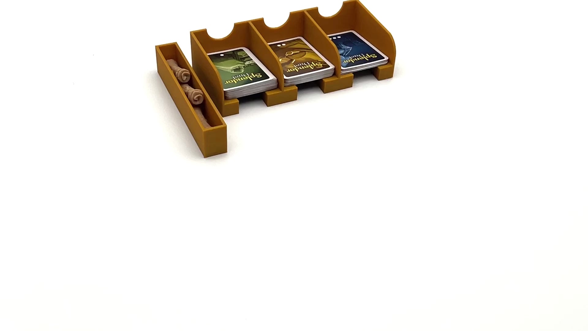 This insert fits in the box perfectly to make setup a breeze. The cardholder is designed at an angle so picking your cards is super easy, with a finger groove in the bottom as well. There is also a storage box for the scrolls. Choose from 4 colors, Gold, Bronze, Silver, or Black. The slots are oversized so they should fit sleeved cards, the dimensions are 48mm x 72mm, so you can verify with your brand of sleeves. Of course, it works great without sleeves too!