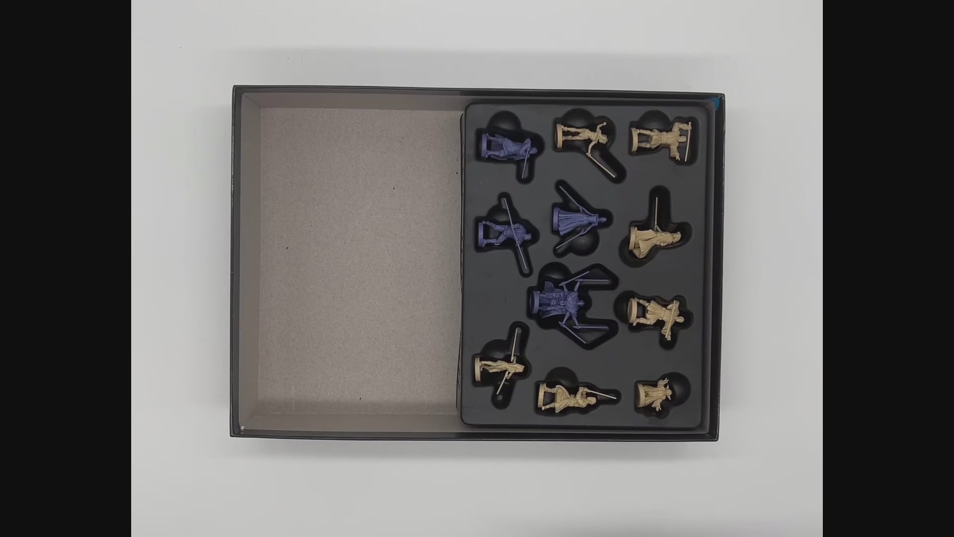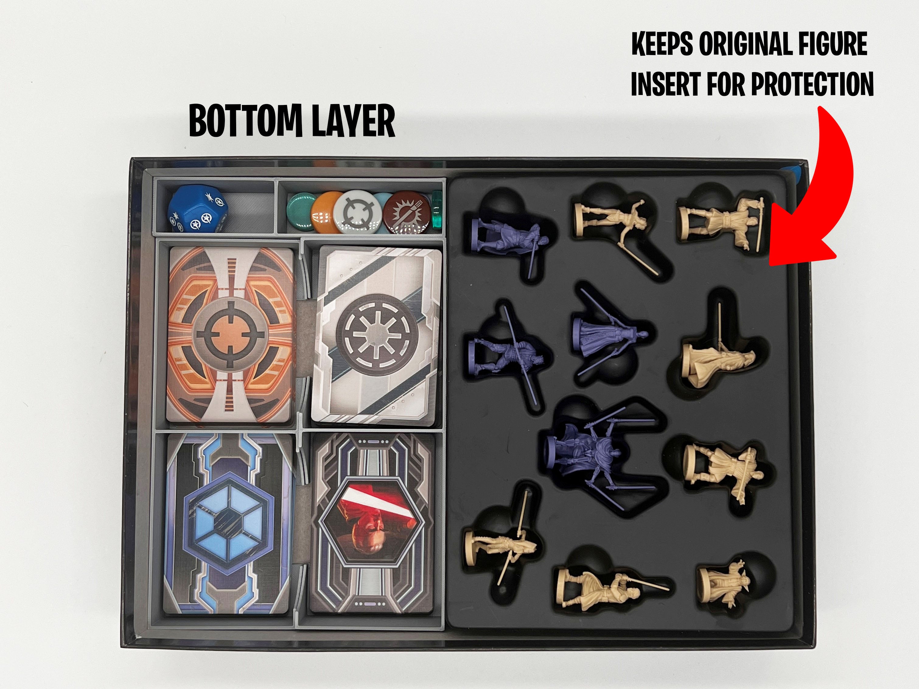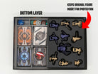 Insert / Organizer for the board game Star Wars: The Clone Wars (Pandemic System). Get to the table with ease and style with our organization system. The invasion and squad card trays have integrated discard areas, and allow for storage of all card types in the box. The trays were designed to accommodate sleeved or unsleeved cards (check dimensions below). All components fit in the box perfectly AND it maintains the original figure storage to protect your figures! No lid creep when closing the box.