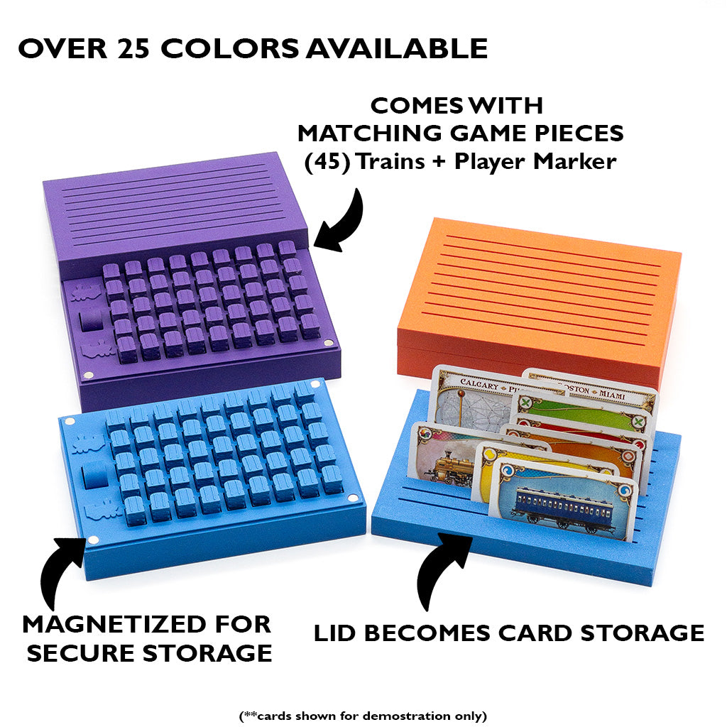 Up your game with these custom-colored game pieces WITH matching game piece holder/case/organizer and card slots. Compatible with games like Ticket To Ride®. The box is magnetic to keep your pieces secured while in storage or traveling. The top and bottom of the case have a nice textured finish.