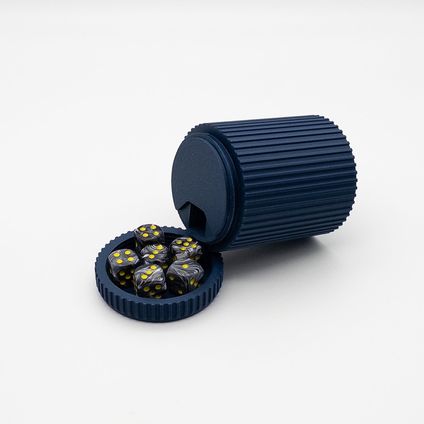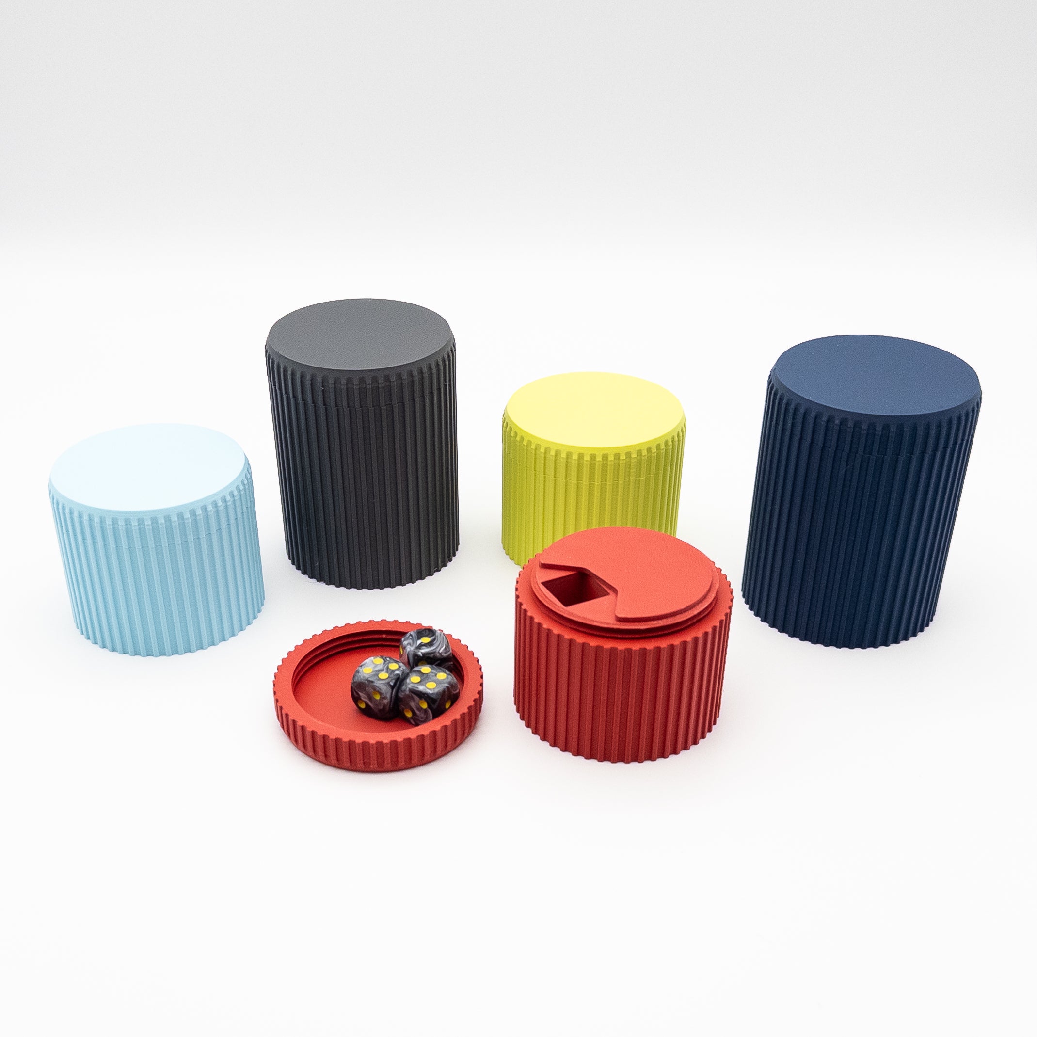 Our BTB Dice Cans are a great addition to your storage solutions; with over 30 colors to choose from, you can have several dice cans in different colors or coordinate with your dice. The lid screws on for secure storage and can also act as a place to hold some dice on your table. A rotating plate allows you to access one bay at a time for easy distribution. Level up your game nights in style. Coordinate colors with our deck boxes and storage trays for a truly coordinated experience.