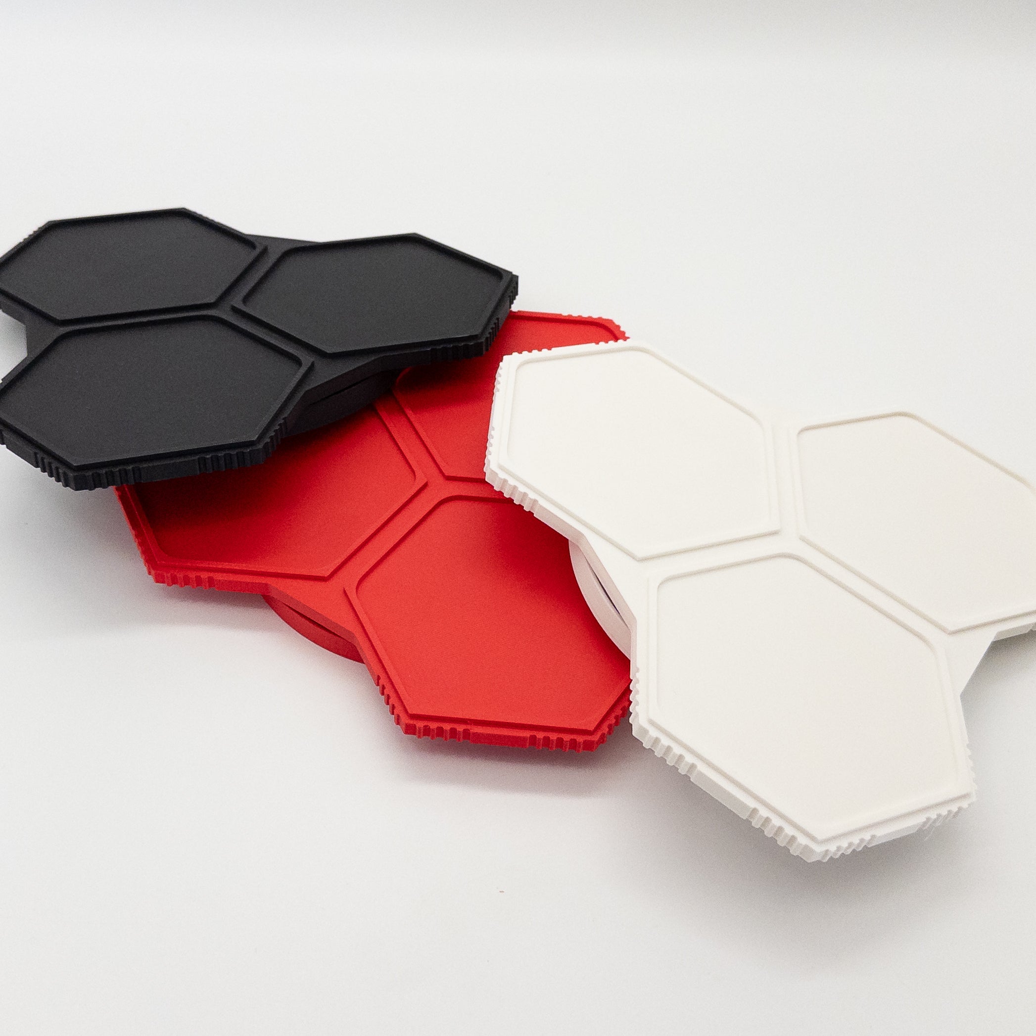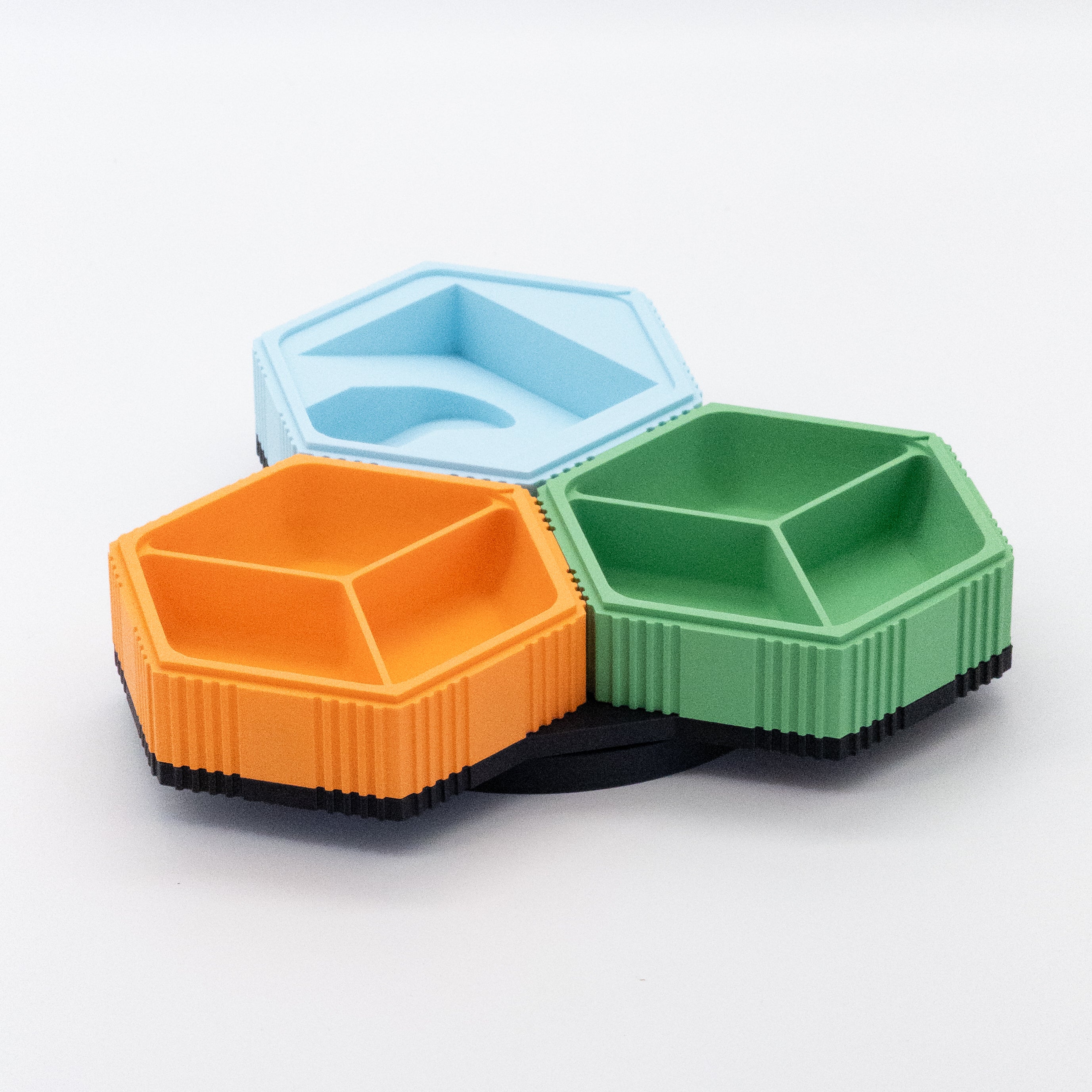 Our hex tray lazy Susan is great for storing our trays, or add it to your table to give easy access to multiple trays. It holds 3 trays and can stack multiple on top for storage!